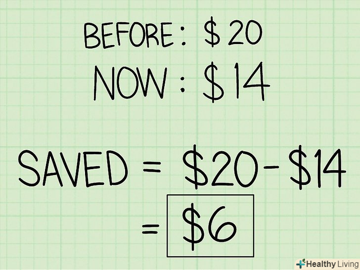 Запишіть початкову ціну і відсоток знижки.у магазинах, як правило, початкова ціна вказується великими цифрами, щоб ви знали, як багато заощадите, якщо купите товар зі знижкою.[10]- Зверніть увагу, чи відноситься відсоток знижки до одного товару або відразу до декількох однотипних товарів.