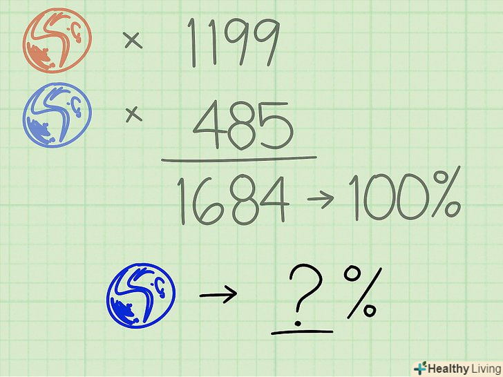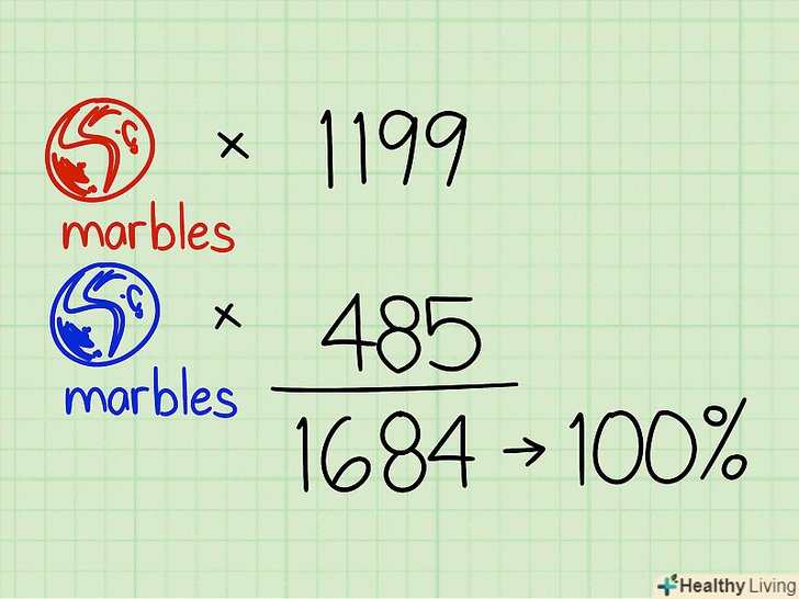 Визначте значення цілого.у деяких випадках значення частини і цілого будуть дані. В інших випадках будуть дані дві частини, які складають ціле. Наприклад, дана банку з 1199 червоними кульками і 485 синіми кульками, тобто загальне число кульок дорівнює 1684. У цьому випадку 1684-це ціле, тобто 100%.[2]