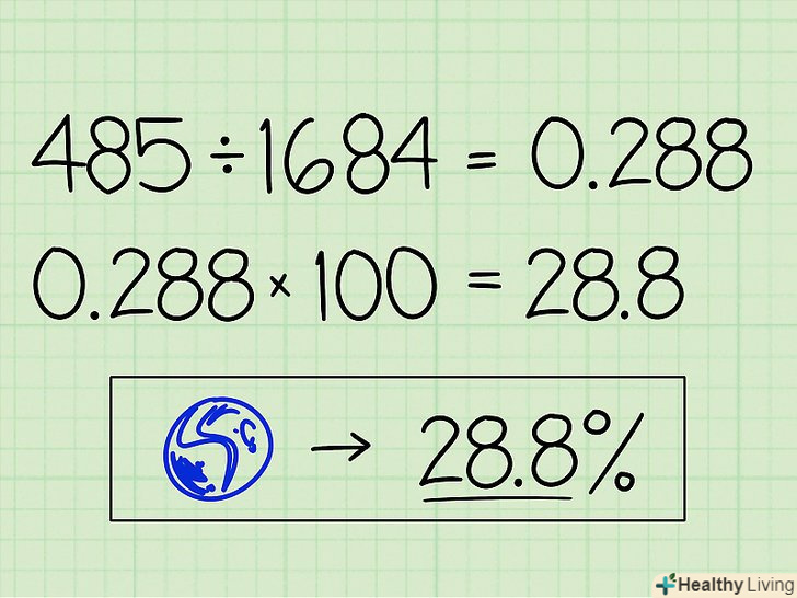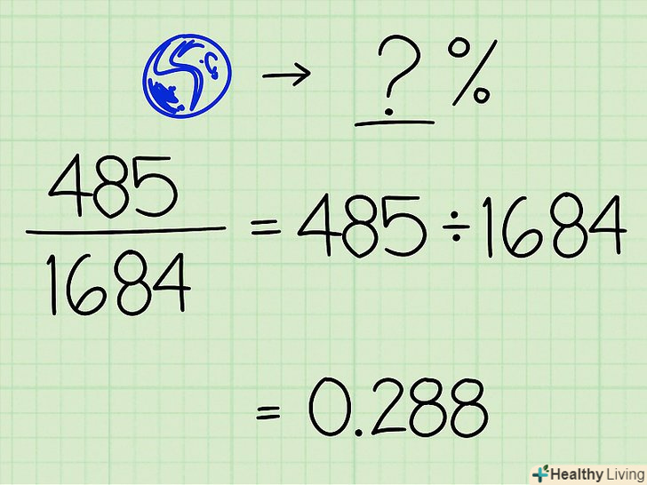 Перетворіть звичайний дріб в десяткову. відсотки краще обчислювати на основі десяткових дробів. Щоб дріб 485/1684 перетворити в десятковий дріб, розділіть 485 на 1684 за допомогою калькулятора або в стовпчик: 485/1684 = 0,288.[5]