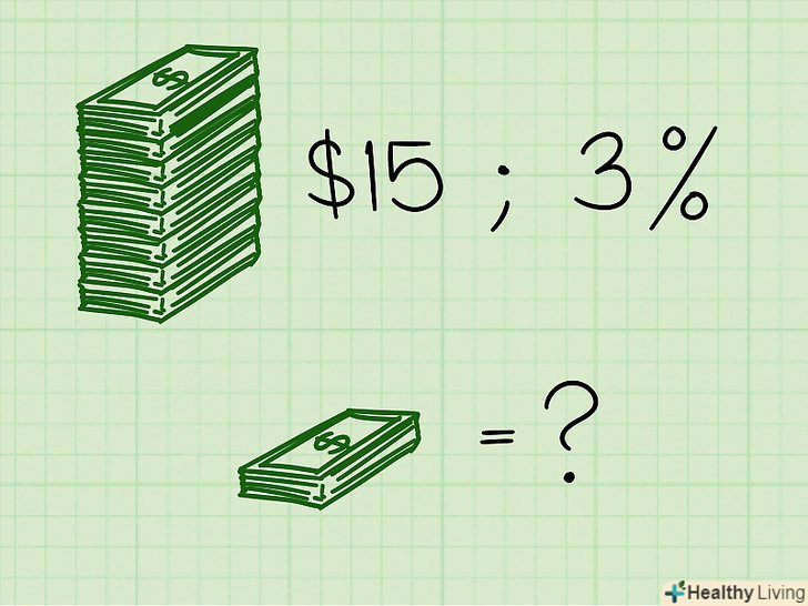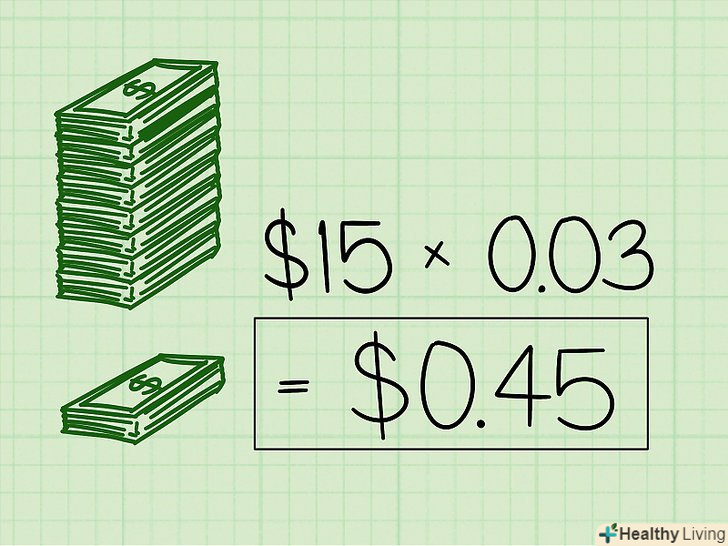 Перепишіть завдання з новими значеннями. Тепер задачу можна сформулювати так: X від Y дорівнює Z, де «X» — десятковий дріб, «від» — множення, «Y» — сума, «Z» — кінцевий результат. Отже, 0,03 x 1500 = 45 рублів.[9]- У нашому прикладі 45 рублів — це сума добового відсотка, яка нараховується щодня.