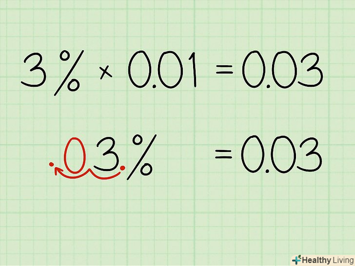Перетворіть відсотки в десятковий дріб.для цього розділіть відсотки на 100 або помножте їх на 0,01 (що одне і те ж): 3%/100% = 3/100 = 0,03. Також можна просто перенести десяткову кому на дві позиції вліво.[8]