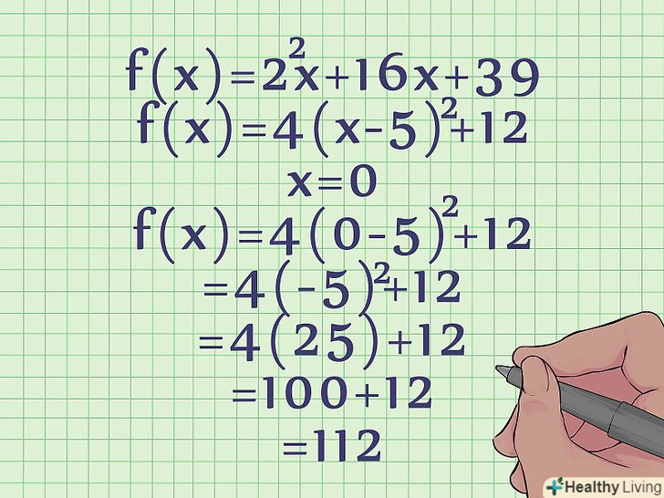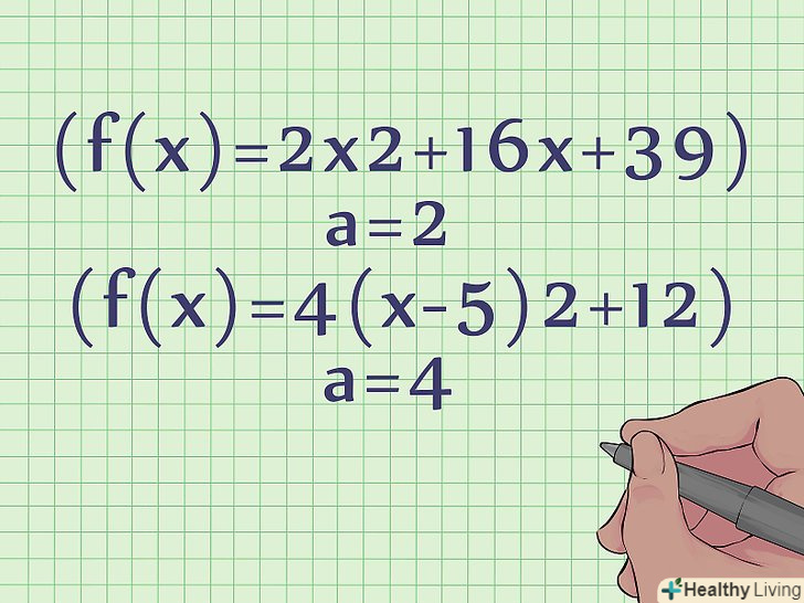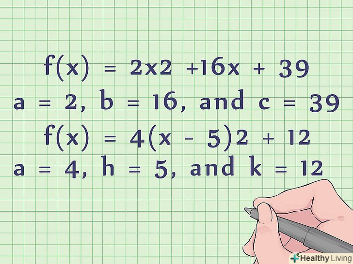 Для побудови графіка необхідно знайти чисельні значення коефіцієнтів a, b, c (або a, h, k).у більшості задач квадратні рівняння даються з чисельними значеннями коефіцієнтів.- Наприклад, у стандартному рівнянні f (x) = 2x2 +16x + 39 a = 2, b = 16, c = 39.