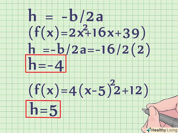 Обчисліть h в стандартному рівнянні (в нестандартному воно вже дано) за формулою: h = -b/2a.- У нашому прикладі стандартного рівняння f(x) = 2x2 +16x + 39 h = - b/2A = -16/2(2) = -4.