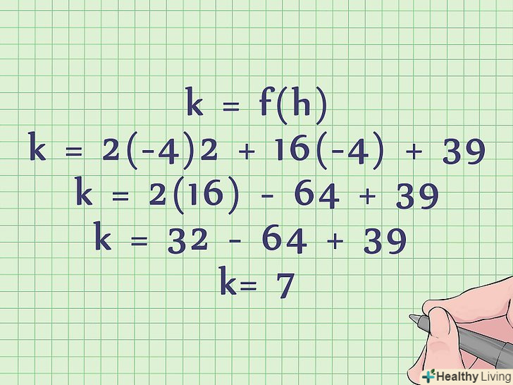 Обчисліть k в стандартному рівнянні (в нестандартному воно вже дано).Пам'ятайте, що k = f (h), тобто ви можете знайти k, підставивши у вихідне рівняння знайдене значення h замість «х».- Ви знайшли, що h = -4 (для стандартного рівняння). Для обчислення k підставте це значення замість " х»:
