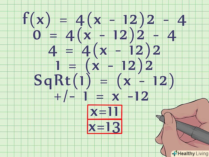 Якщо потрібно, знайдіть і нанесіть точки перетину з віссю х. ці точки дуже допоможуть вам при побудові параболи. Їх може бути дві, одна або жодної (якщо парабола спрямована вгору, а її вершина лежить вище осі Х, або якщо парабола спрямована вниз, а її вершина лежить нижче осі Х). Для обчислення координат точок перетину з віссю Х виконайте наступні дії:- Прирівняйте рівняння до нуля: f (х) = 0 і вирішіть його. Цей метод працює з простими квадратними рівняннями (особливо нестандартного вигляду), але може виявитися надзвичайно важким у випадку складних рівнянь. У нашому прикладі: