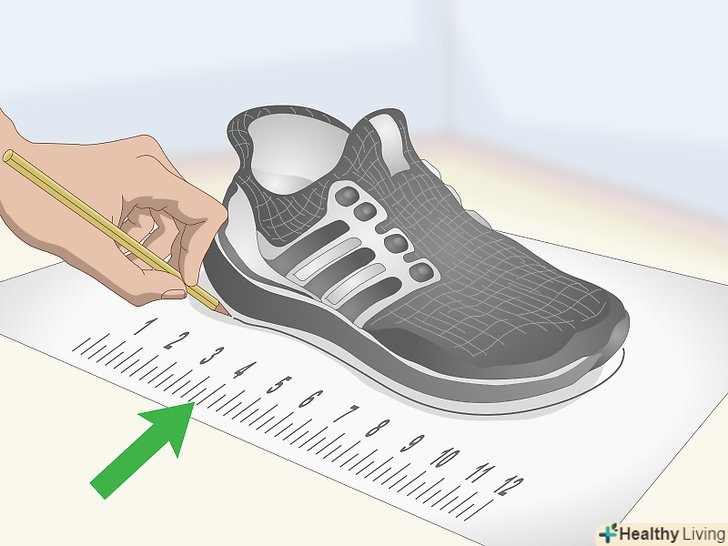 Переведіть розмір вашого взуття в сантиметри.якщо ви знаєте ваш розмір взуття, можна використовувати його для приблизних вимірювань. Знайдіть в Інтернеті таблицю розмірів, щоб визначити довжину вашої ступні за розміром взуття. Потім, поставте ногу на аркуш паперу і відзначте носок і п'яту. Використовуйте отриману довжину вашої ступні для вимірювання відстані від підлоги до позначки вашого зростання.[8]- Наприклад, російський розмір взуття 35 приблизно відповідає довжині стопи 23 см, а розмір 40 — 26 см.