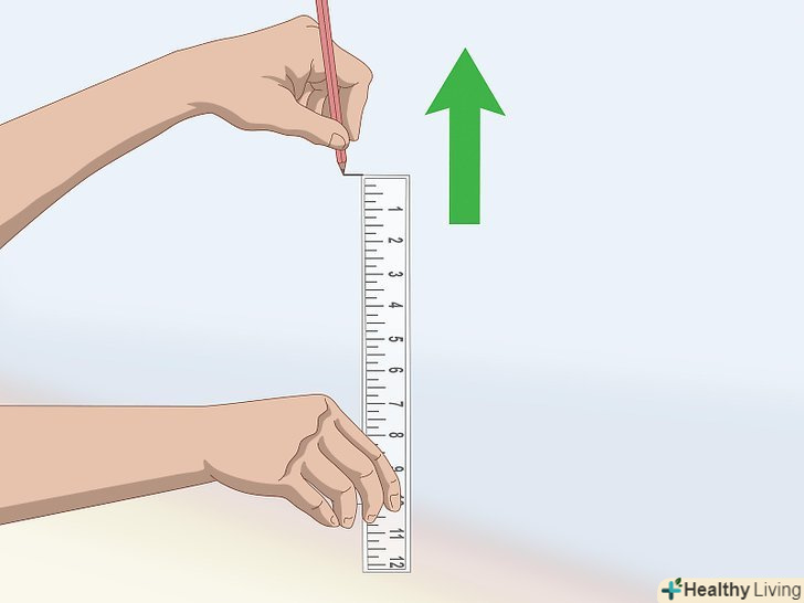 Виміряйте відстань від підлоги до позначкиЛінійкою.встановіть лінійку одним кінцем на підлозі вертикально вздовж стіни. Відзначте верхній край лінійки олівцем. Потім посуньте лінійку так, щоб її нижній край збігся зі зробленою відміткою і зробіть нову позначку у її верхнього краю.- Повторюйте цю процедуру, поки не дійдете до позначки вашого зростання.