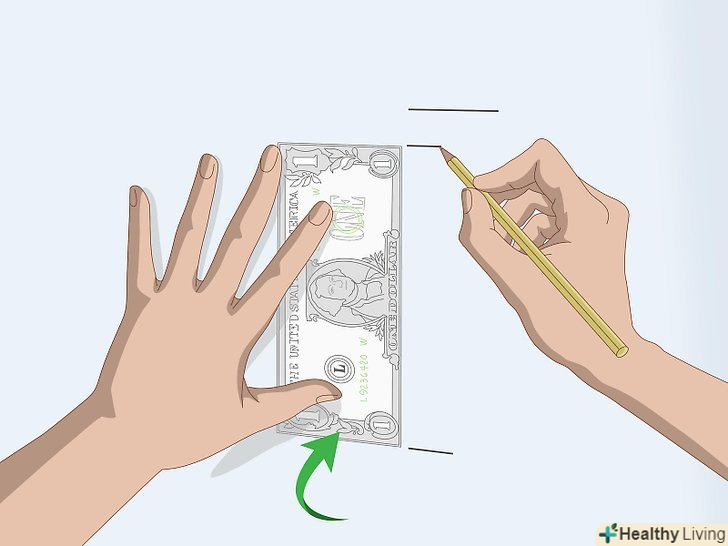 Використовуйте банкноту, щоб виміряти відстань до позначки.підійде будь — яка банкнота, головне, знати її розміри-їх можна подивитися в Інтернеті. Наприклад, російські банкноти номіналом в 50, 100, 200 і 500 рублів мають розмір 15 см в довжину і 6,5 см у висоту. Прикладіть банкноту до стіни довгою стороною знизу вгору і зрушуйте її вниз, поки нижній край банкноти не торкнеться підлоги. Відзначте положення верхнього краю банкноти олівцем. Посуньте банкноту вгору так, щоб її нижній край виявився у зробленої вами позначки, і зробіть нову позначку у її верхнього краю.[6]- Продовжуйте, поки не дійдете до позначки вашого зростання.