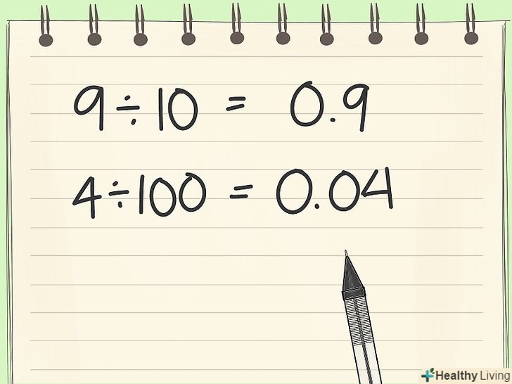 Цифри праворуч від десяткової коми множаться на відповідні дроби.- приклад: [9* (1/10)] + [4* (1/100)] = [9/10] + [4/100] = 0,9 + 0,04.