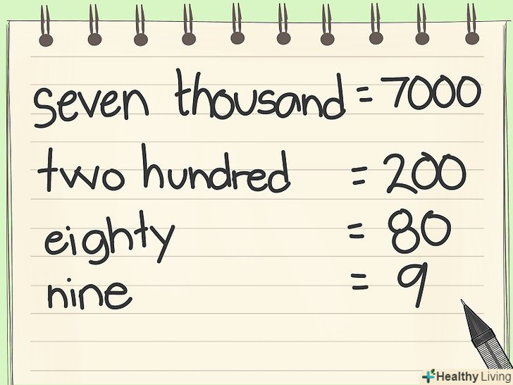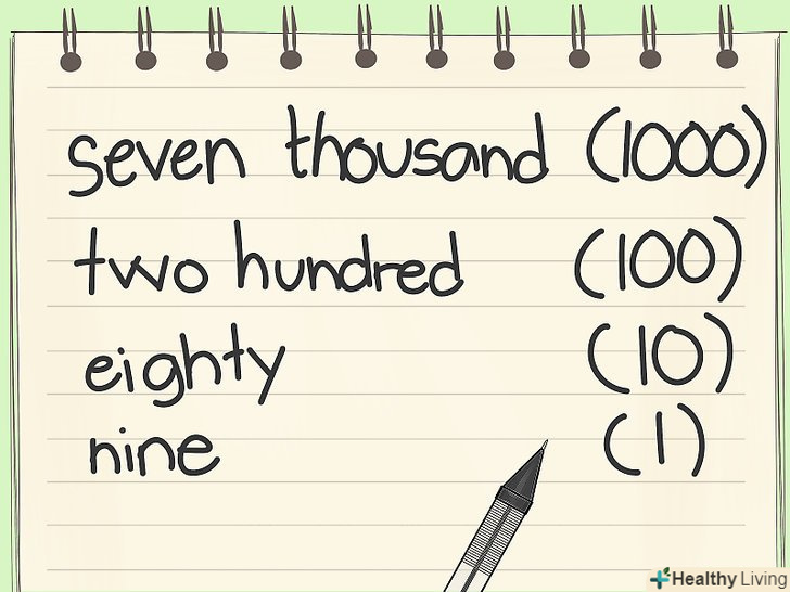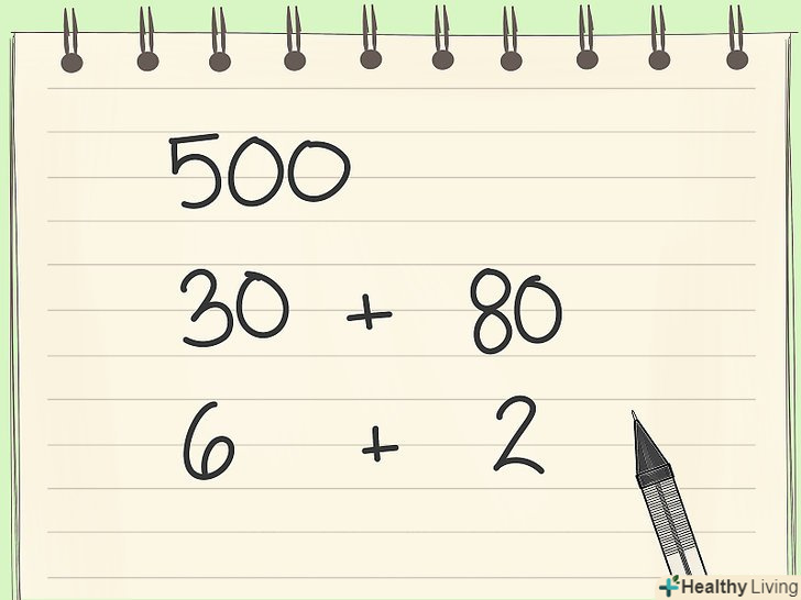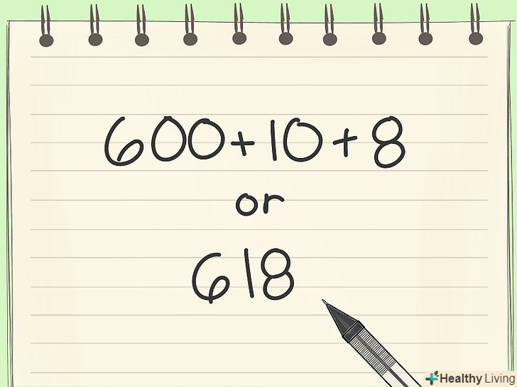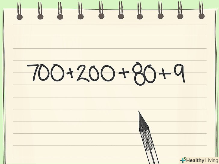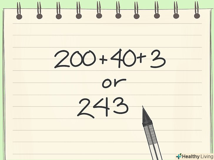 Напишіть дане число у вигляді суми його цифр, а біля кожної цифри напишіть назву значення відповідної позиції.- Зверніть увагу, що «одиниці» не пишуться, але ви можете це зробити для кращого розуміння процесу.