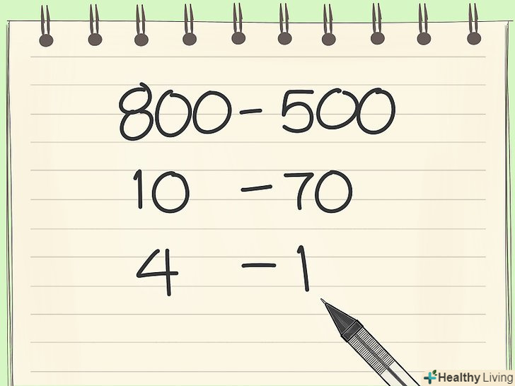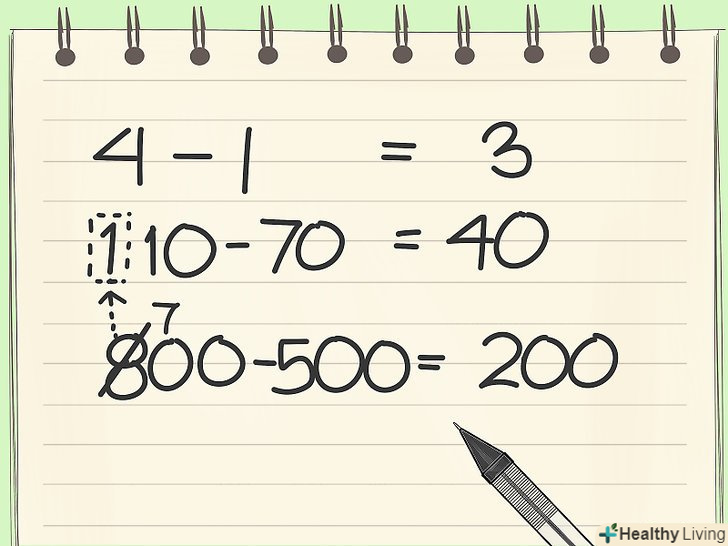 Відніміть числа однакової значності, починаючи з чисел найменшої значності.- Якщо зменшуване менше віднімається, то необхідно взяти одну десятку у десятків, якщо віднімаються одиниці, взяти одну сотню у сотень, якщо віднімаються десятки, і так далі.