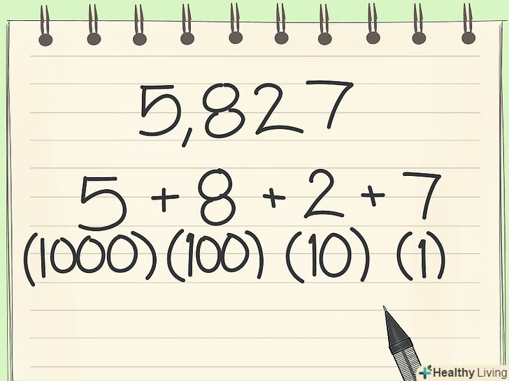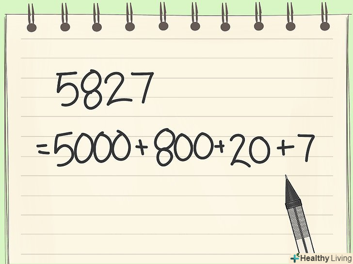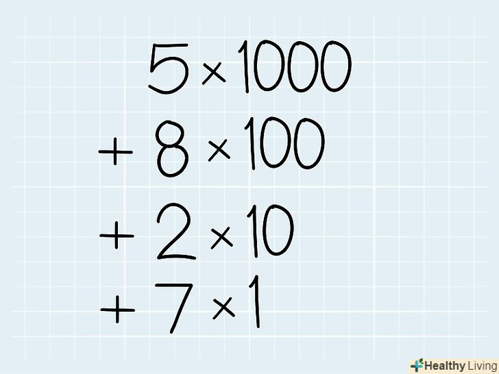 Помножте кожну цифру даного числа на значення відповідної їй позиції.- приклад: [5 * 1000] + [8 * 100] + [2 * 10] + [7 * 1]