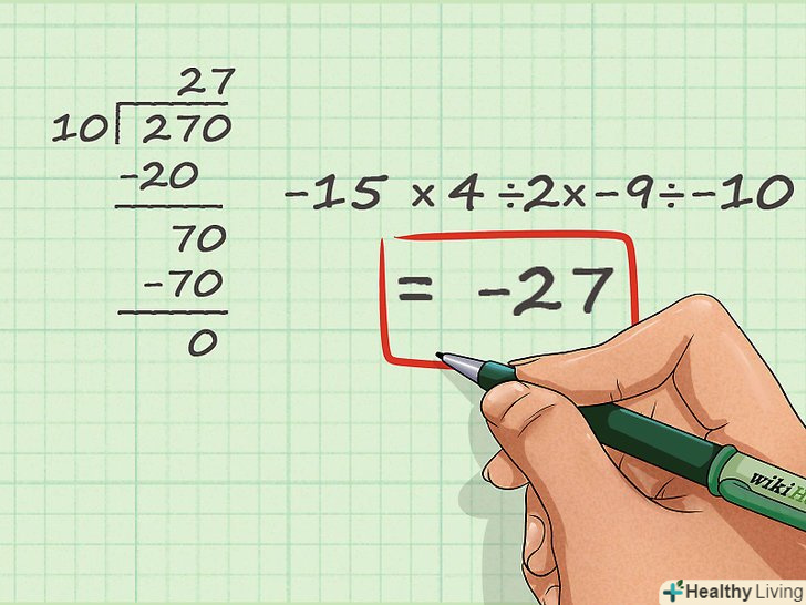 - Давайте використовуємо ділення в стовпчик в нашому прикладі. Ми можемо спростити наше завдання: -15 × (2) × -9 ÷ -10 = 270 ÷ -10. Ми ігноруємо знаки, оскільки ми вже знаємо знак остаточної відповіді. Напишіть 10 (дільник) справа, а 270 (ділене) - зліва.