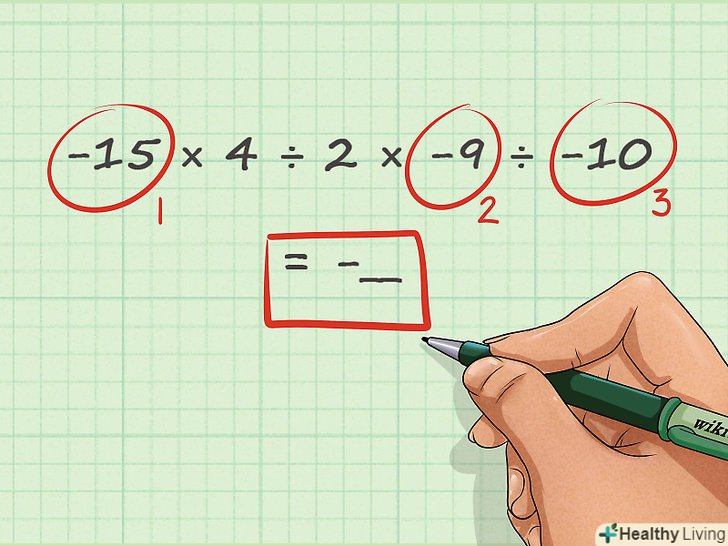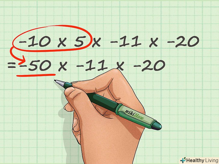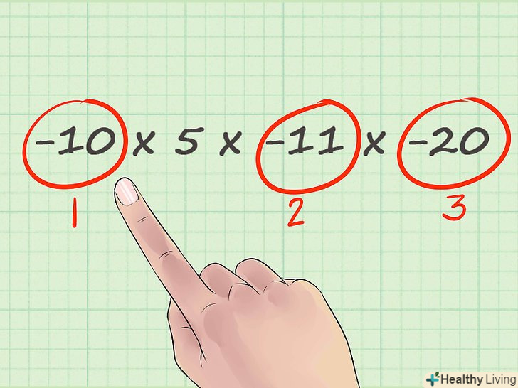 Підрахуйте кількість негативних чисел у вашому завданні.при множенні двох або більше позитивних чисел відповідь завжди буде позитивною. Але якщо в задачі кількість негативних чисел – парне, то результат буде позитивним; якщо в задачі кількість негативних чисел – непарне, то результат буде негативним. Тому перед початком множення цілих чисел підрахуйте кількість негативних чисел в задачі.- Наприклад: -10 × 5 × -11 × -20. У цьому завданні є три негативних числа. Ми будемо використовувати цю інформацію далі.