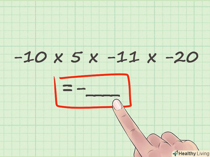Визначте знак вашої відповіді. як зазначено вище, при перемноженні тільки позитивних чисел відповідь завжди позитивний, але якщо в задачі присутні негативні числа, то відповідь або позитивний (парна кількість негативних чисел), або негативний (непарна кількість негативних чисел).- У нашому прикладі є три негативних числа. Три-Непарне число, тому відповідь буде негативною. Ми можемо відразу написати знак мінус у відповіді (після знака одно), наприклад: -10 × 5 × -11 × -20 = - __