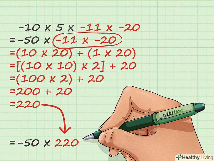 При необхідності розкладіть велике число на менші числа.якщо завдання включає числа більше десяти, не обов'язково використовувати множення в стовпчик. Для початку визначте, чи можна розкласти одне або кілька великих чисел на менші числа, а потім скористайтеся таблицею множення.- Розглянемо другу половину нашого прикладу: -11 x -20. Знаки не враховуються, тому що ми вже знайшли знак відповіді. 11 × 20 = (10 + 1) × 20= 10 × 20 + 1 × 20 = 10 × (2 × 10) + 1 × 20 = 2 × (10 × 10) + 1 × 20 = 220. Ми можемо підставити цей результат в нашу задачу: (50) × (220) = - __