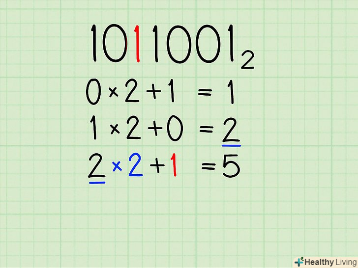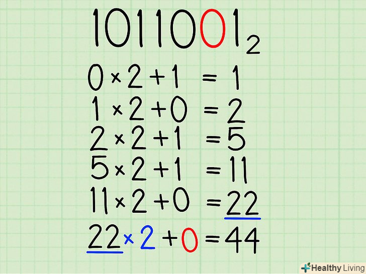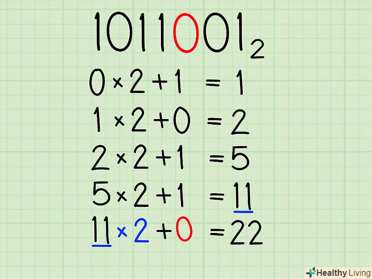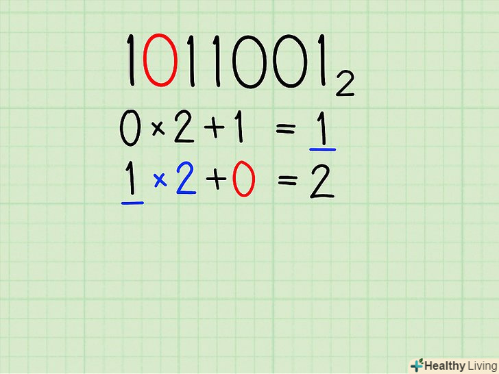 Подвойте ваш поточний підсумок і додайте наступну цифру зліва.Ваш поточний підсумок дорівнює 1, а ваша нова цифра 0. Так подвоюйте 1 і додайте 0. 1 x 2 + 0 = 2. Ваш новий підсумок дорівнює 2.