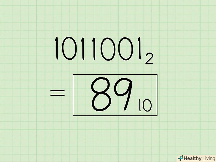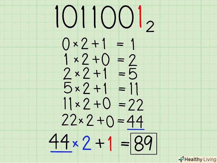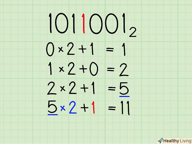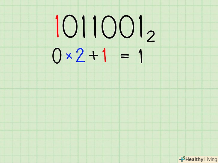 Починаючи зліва, подвойте ваш попередній підсумок і додайте поточну цифру. Так як ви працюєте з двійковим числом 1011001 2, ваша перша цифра зліва дорівнює 1. Ваш попередній підсумок дорівнює 0, так як ви ще не почали. Вам необхідно подвоїти попередній підсумок, 0, і додати 1, поточну цифру. 0 x 2 + 1 = 1, так що ваш новий підсумок дорівнює 1.
