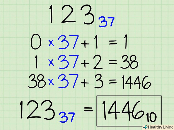 Використовуйте цей метод для перетворення збудь-якого підстави в десяткове. Ми використовували подвоєння, тому що основа нашої системи числення дорівнює 2. Якщо дане вам число буде мати іншу підставу, замініть 2 на підставу системи числення, в якій записано дане число. Наприклад, якщо вам дали число по підставі 37, вам необхідно замінити "x 2" на "x 37". Отриманий результат завжди буде в десятковій системі (по підставі 10).