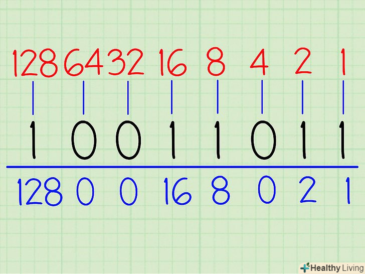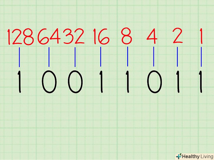 Запишіть цифри двійкового числа під відповідними ступенями двійки. Тепер просто запишіть 10011011 під числами 128, 64, 32, 16, 8, 4, 2, і 1, з тим щоб кожна двійкова цифра відповідала своїй мірі двійки. Сама права " 1 "двійкового числа повинна відповідати самій правій" 1 " з ступенів двійок, і так далі. Якщо вам зручніше, ви можете записати двійкове число над ступенями двійки. Найважливіше - щоб вони відповідали один одному.