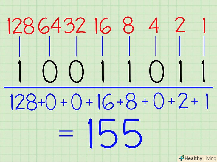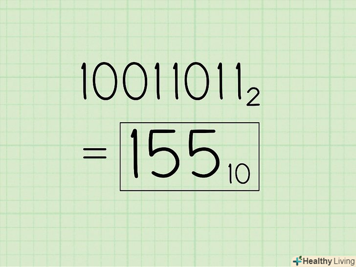 Складіть отримані значення. Тепер складіть отримані під лінією цифри. Ось що ви повинні зробити: 128 + 0 + 0 + 16 + 8 + 0 + 2 + 1 = 155. Це десятковий еквівалент двійкового числа 10011011.