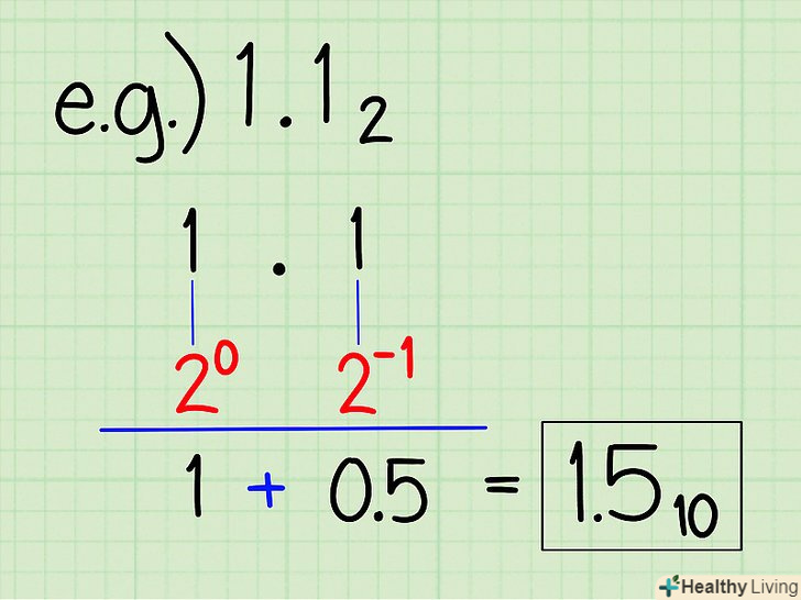 Використовуйте цей метод, щоб перетворити двійкове число з десятковою крапкою в десяткову форму. ви можете використовувати цей метод навіть якщо ви хочете перетворити двійкове число, таке як 1.12 в десяткове. Все, що Вам необхідно знати – це те, що число в лівій частині десяткового числа – це звичайне число, а число в правій частині десяткового числа – це число "поділів надвоє", або 1 x (1/2).- " 1 " зліва від десяткового числа відповідає 20, або 1. 1 праворуч від десяткового числа відповідає 2-1, або .5. Складіть 1 і .5 і ви отримаєте 1.5, яке є еквівалентом 1.12 в десятковому вигляді.