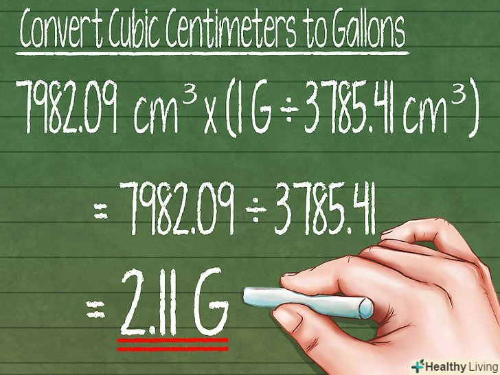 Переклад кубічних сантиметрів в галони. в 1 галоні 3785,41 кубічного сантиметра. Щоб дізнатися, скільки галонів в ємності, обсяг якої виражений в кубічних сантиметрах, потрібно це кількість кубічних сантиметрів розділити на 3785,41.- приклад. обсяг балона становить 7982,09 куб. сантиметра. Знайдіть його обсяг в галонах.