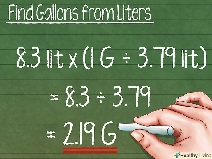 Переклад літрів в галони.в 1 галоні 3,79 літра.[4] щоб дізнатися, скільки галонів в ємності, обсяг якої виражений в літрах, потрібно це кількість літрів розділити на 3,79.- приклад. обсяг балона становить 8,3 літра. Знайдіть його обсяг в галонах.