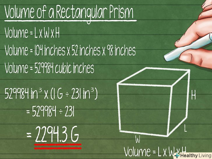 Обчислення об'єму прямокутного паралелепіпеда.щоб дізнатися обсяг прямокутного паралелепіпеда, треба помножити його довжину на ширину і на висоту. Потім, користуючись викладеними вище інструкціями, потрібно перевести отриманий результат в галони.- приклад. довжина прямокутного бака становить 104 дюйма, його ширина — 52 дюйма, а Висота — 98 дюймів. Обчисліть обсяг бака в галонах.