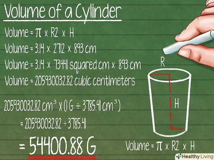 Обчислення об'єму циліндра.щоб дізнатися обсяг циліндра, треба помножити число π на квадрат радіуса підстави циліндра і на його висоту. Потім потрібно перевести отриманий результат в галони.- приклад. висота циліндричного резервуара становить 893 см, а радіус його заснування - 271 см.обчисліть обсяг резервуара в галонах.