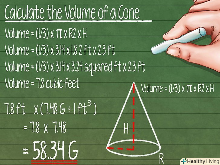 Обчислення обсягу конуса.щоб дізнатися обсяг конуса, треба помножити число π на його висоту і на квадрат радіуса його заснування, а вийшло значення розділити на 3. Потім потрібно перевести отриманий результат в галони.- приклад. Висота конічного контейнера становить 2,3 фута, а радіус його заснування - 1,8 фута. Обчисліть Обсяг контейнера в галонах.