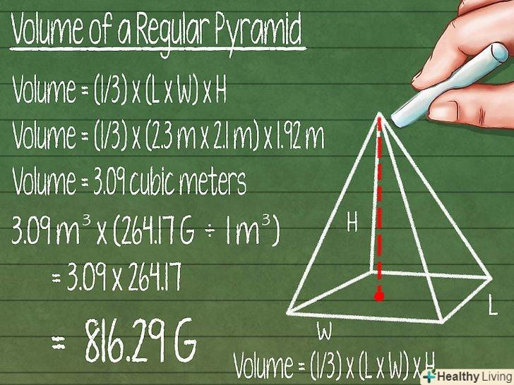 Обчислення обсягу правильної піраміди.щоб дізнатися обсяг правильної піраміди, треба помножити площу її підстави на висоту, а вийшло значення розділити на 3. Потім потрібно перевести отриманий результат в галони.- приклад. Висота пірамідального бака становить 1,91 метра, а його основа має довжину 2,3 метра і ширину 2,1 метра. Обчисліть обсяг бака в галонах.