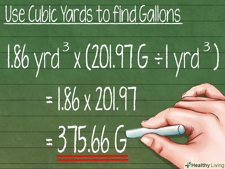 Переклад кубічних ярдів в галони. в 1 кубічному Ярді 201,97 галона. Щоб дізнатися, скільки галонів в ємності, обсяг якої виражений в кубічних ярдах, потрібно цю кількість кубічних ярдів помножити на 201,97.- приклад. обсяг басейну становить 1,86 куб.ярда. Знайдіть його обсяг в галонах.