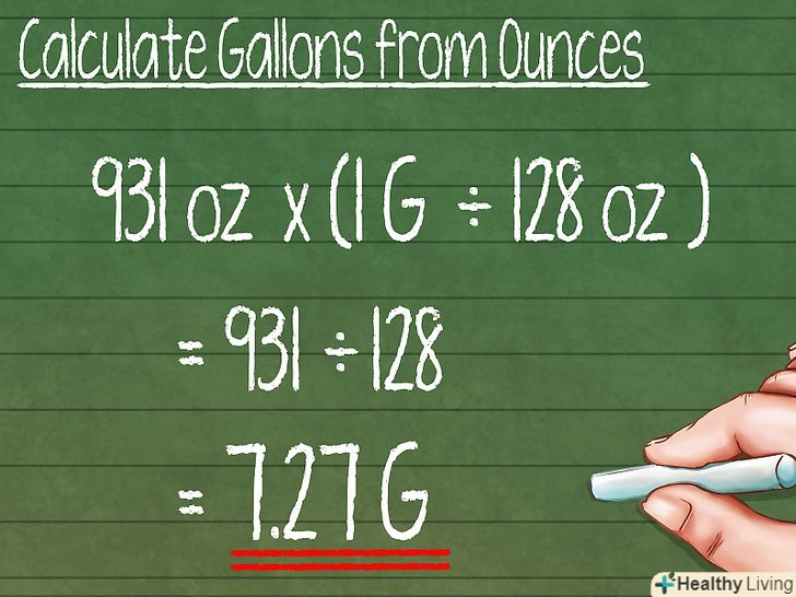 Переклад унцій в галони. В 1 галоні 128 унцій.[2] щоб дізнатися, скільки галонів в ємності, обсяг якої виражений в унціях, потрібно цю кількість унцій розділити на 128.- приклад. обсяг балона становить 931 унцію. Знайдіть його обсяг в галонах.