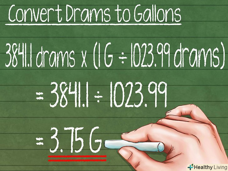 Переклад драхм в галони. в 1 галоні 1023,99 драхми. Щоб дізнатися, скільки галонів в ємності, обсяг якої виражений в драхмах, потрібно це кількість драхм розділити на 1023,99.[3]- приклад. обсяг балона становить 3841,1 драхми. Знайдіть його обсяг в галонах.