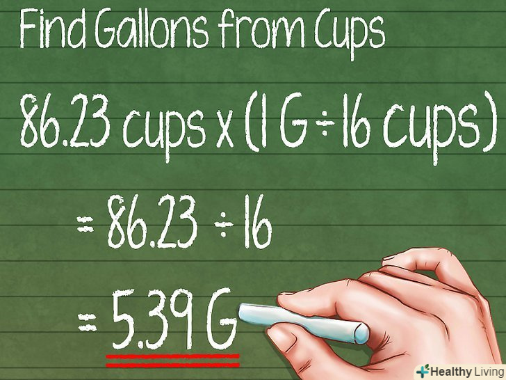 - 86,23 чашки * (1 галон / 16 чашок) = 86,23 / 16 = 5,39 галона