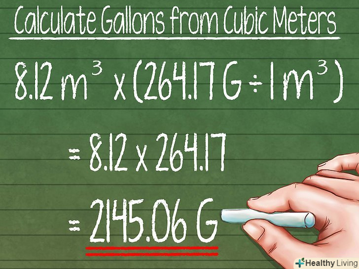 Переклад кубічних метрів в галони. в 1 кубічному метрі 264,17 галона. Щоб дізнатися, скільки галонів в ємності, обсяг якої виражений в кубічних метрах, потрібно це кількість кубічних метрів помножити на 264,17.- приклад. обсяг басейну становить 8,12 куб. метра. Знайдіть його обсяг в галонах.