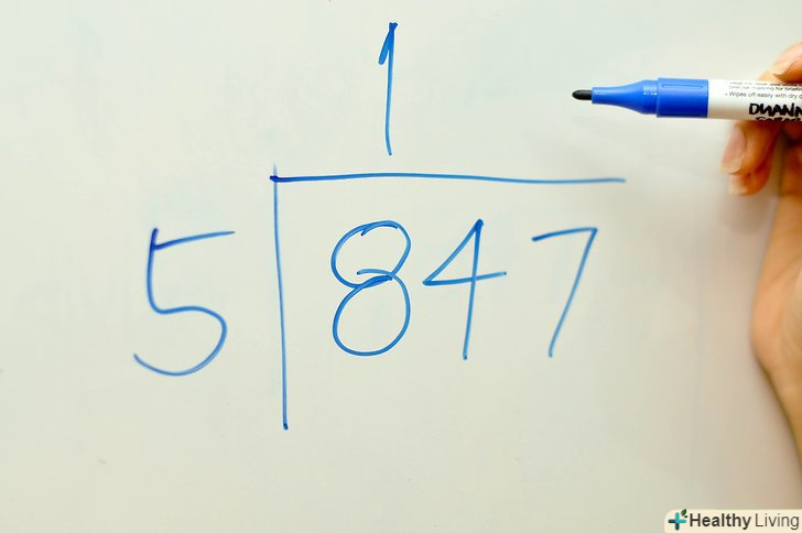Розділіть першу цифру діленого на дільник.у цьому випадку 8 розділити на 5 дорівнює 1 із залишком 3. Напишіть цифру 1 під рисою.