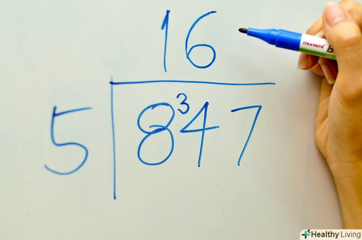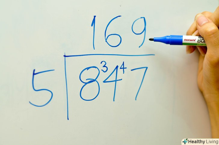 Напишіть над першою цифрою діленого залишок. напишіть невелику цифру 3 праворуч над цифрою 8 в числі 847. Це буде нагадувати вам про залишок 3 (від ділення 8 на 5).