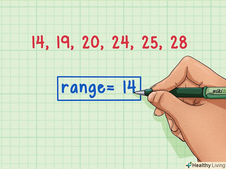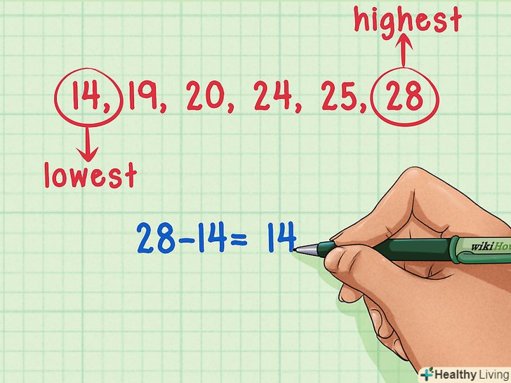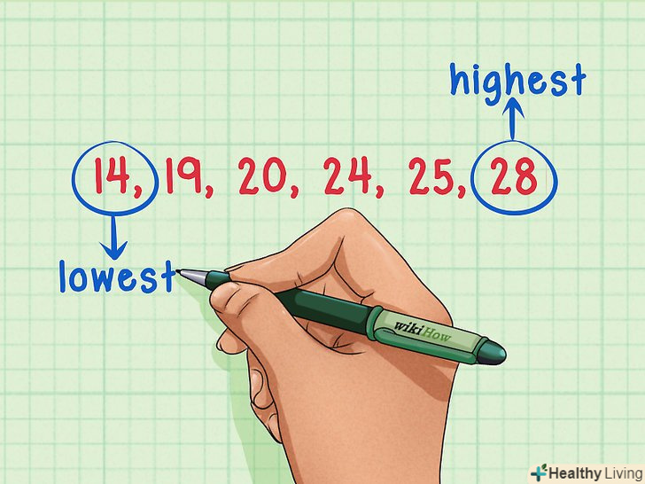 Запишіть значення сукупності даних.щоб знайти розмах, потрібно перерахувати всі значення для визначення максимального і мінімального чисел. Наприклад: 14 , 19, 20 , 24, 25, 28.- Буде легше визначити найбільше і найменше значення в сукупності, якщо ви запишете значення в порядку зростання. У нашому прикладі: 14, 19, 20, 24, 24, 25, 28 .