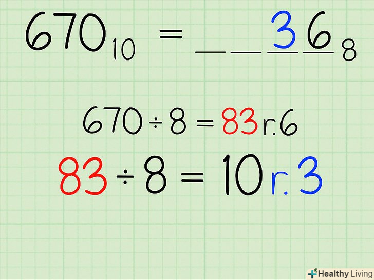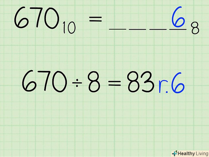 Знайдіть залишок. Ви знайшли, скільки 8 в даному вам числі, тому залишок - це цифра, яка записується першою праворуч (розряд 80) у вісімковому числі. Запам'ятайте: залишок завжди менше 8.[3]- У нашому прикладі: 670 ÷ 8 = 83,Залишок 6.