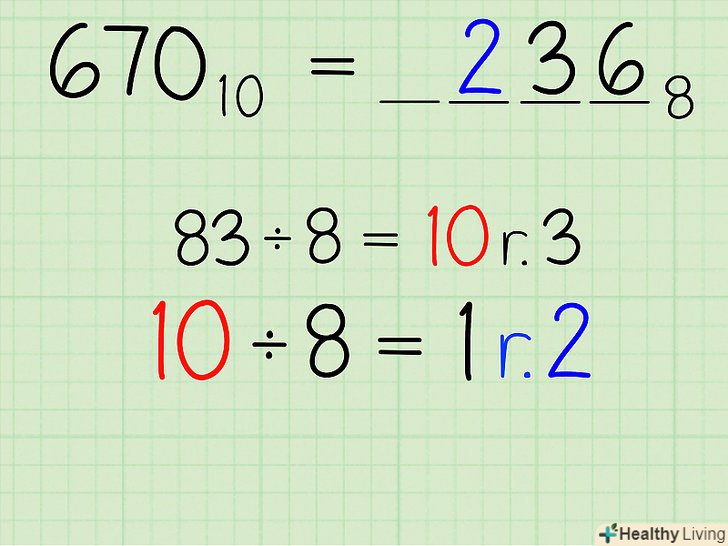 У вісімковій системі числення використовуються тільки вісім цифр (від 0 до 7). Числа цієї системи дуже легко перетворити в Числа двійкової системи, так як кожна цифра вісімкової системи відповідає певній комбінації трьох цифр двійкової системи.[1] але перетворити число десяткової системи числення в число вісімкової системи не так просто; хоча для цього знадобиться тільки вміння ділити в стовпчик. Метод ділення досить простий, а ось метод залишків трохи складніший для розуміння (але в ньому також використовується поділ в стовпчик).