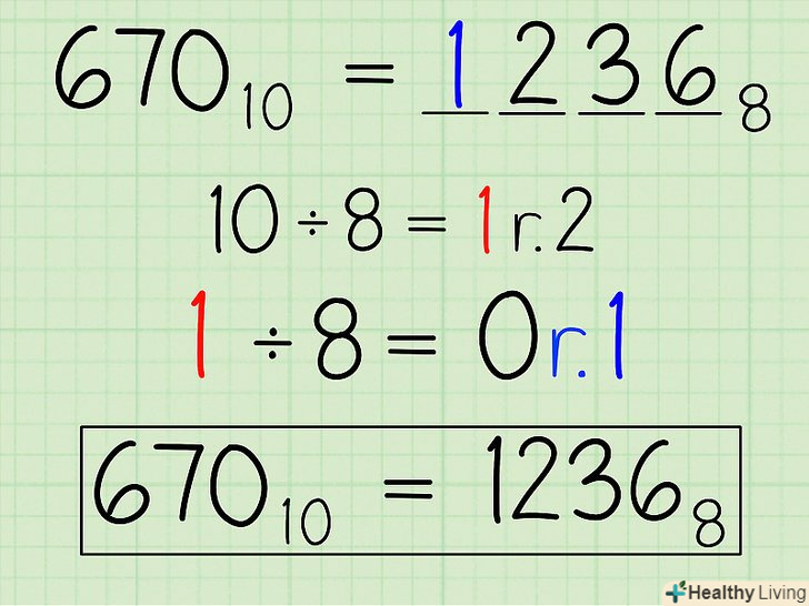 Візьміть будь-яке десяткове число.наприклад, розглянемо десяткове число 670.- За допомогою цього методу ви швидше перетворите десяткове число в вісімкове, але його складно зрозуміти (якщо це ваш випадок, користуйтеся методом 1).