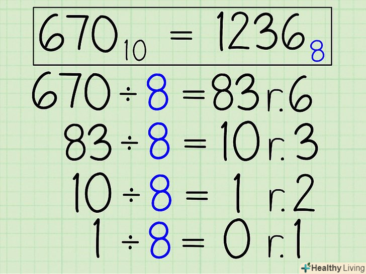 Використовуйте цей метод, щоб зрозуміти суть перетворення.даний метод легше зрозуміти, ніж той, який викладений у другому розділі. Якщо ви вмієте працювати з різними системами числення, перейдіть до більш швидкого методу залишків (метод 2).
