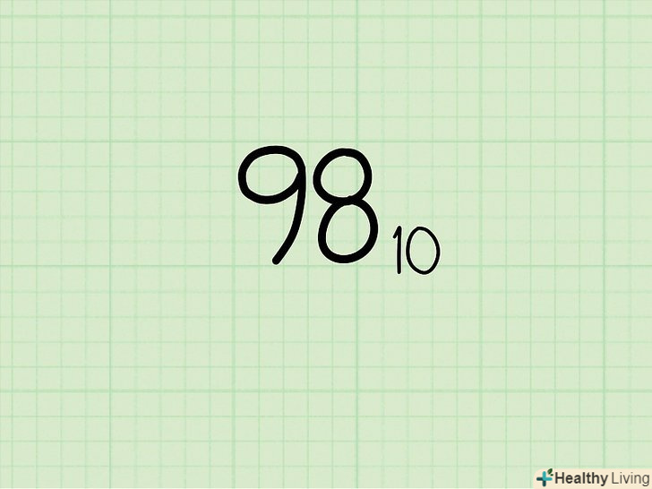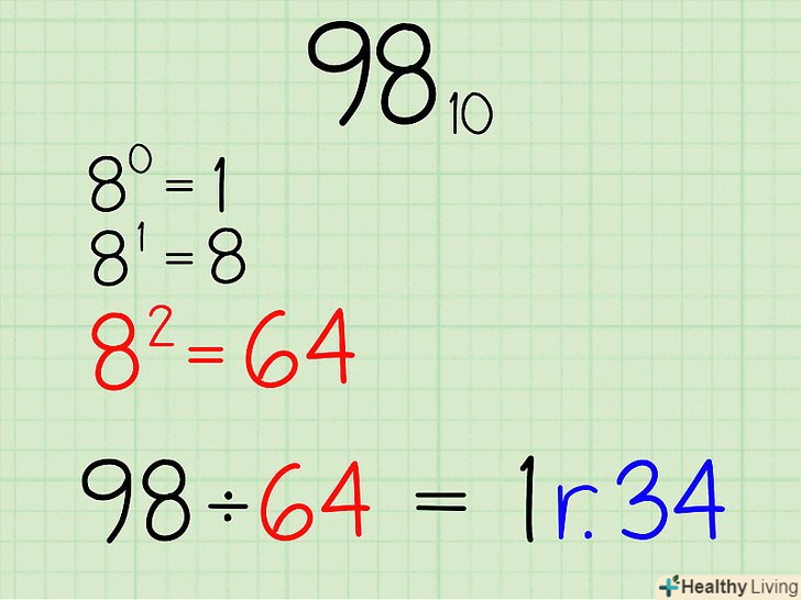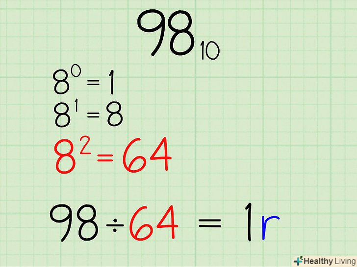 Розділіть десяткове число на 8 найбільшою мірою. нам дано число 98. У ньому дев'ять десятків, так як цифра 9 стоїть в розряді десятків. Для перетворення числа в вісімкову систему необхідно з'ясувати, скільки в ньому 64; для цього розділіть 98 на 64. Запишіть операцію ділення наступним чином:[2]- 98