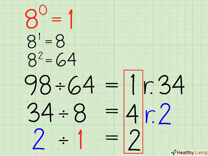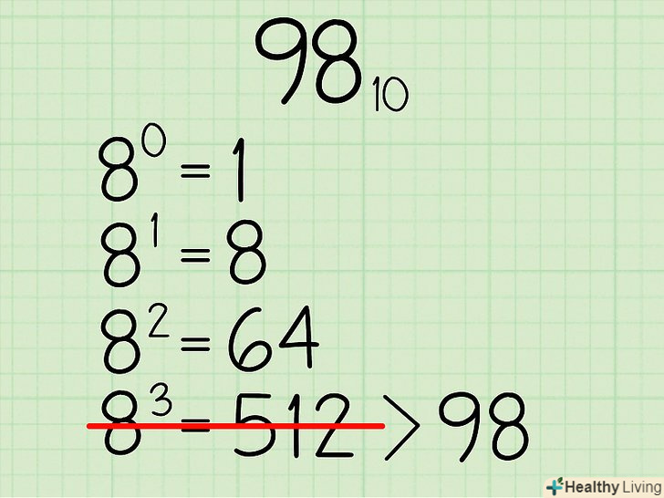 - Тут ми обмежилися 82, тому що 83 = 512, а це число більше даного нам числа (98), що суперечить правилам описуваного методу.