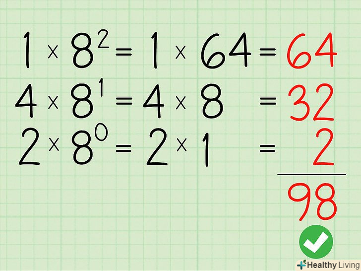 Запишіть ступені 8. Запам'ятайте: у десятковій системі певний розряд числа відповідає 10 у відповідній мірі. Наприклад, є розряд одиниць, десятків і сотень. Ви можете вказати ці розряди так: 100, 101, 102. У вісімковій системі розряди числа відповідають 8 певною мірою. Запишіть кілька розрядів у вигляді 8 у відповідній мірі, починаючи з найбільшою. Зверніть увагу, що цей запис ви робите в десятковій системі числення:- 82 81 80