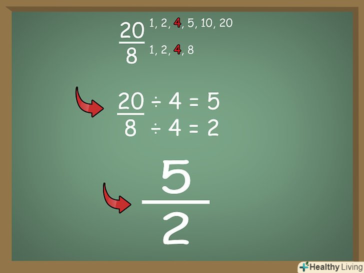 - У нашому прикладі НСД=4. Щоб спростити співвідношення, розділіть 20 і 8 на 4: