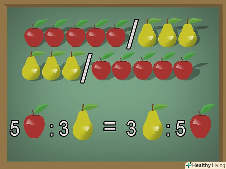 Порядок членів у співвідношенні не має значення. вираз» 5 яблук до 3 груш «аналогічно виразу»3 груші до 5 яблук". Таким чином, 5 яблук/3 грушами = 3 груші / 5 яблукам.