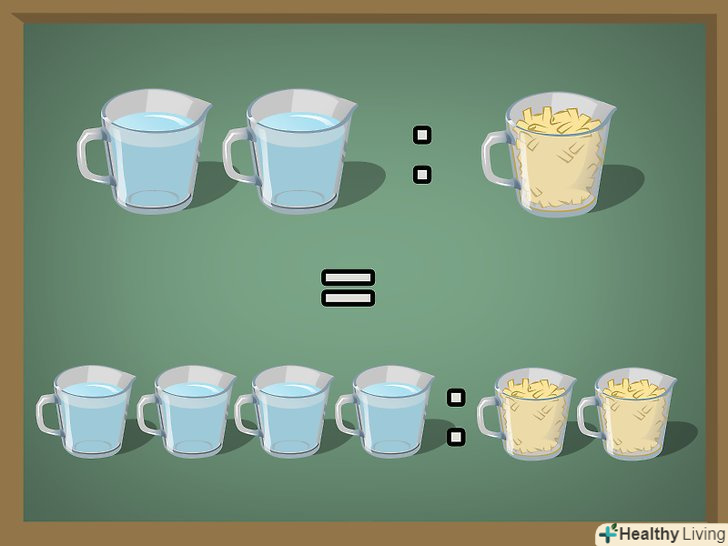 Ви можете збільшувати або зменшувати співвідношення. при спрощенні співвідношення ви зменшуєте його, але ви можете і збільшувати співвідношення. Наприклад, ви знаєте, що для приготування 100 г макаронів потрібно 2 склянки води (співвідношення: 2 склянки води/100 г макаронів). Якщо ви хочете дізнатися, скільки склянок води потрібно для приготування 200 г макаронів, розділіть 200 на 100 і отримаєте 2. Потім отримане значення помножте на 2 склянки (2*2=4). Таким чином, збільшене співвідношення запишеться так: 4 склянки води/200 г макаронів (тобто для приготування 200 г макаронів потрібно 4 склянки води).
